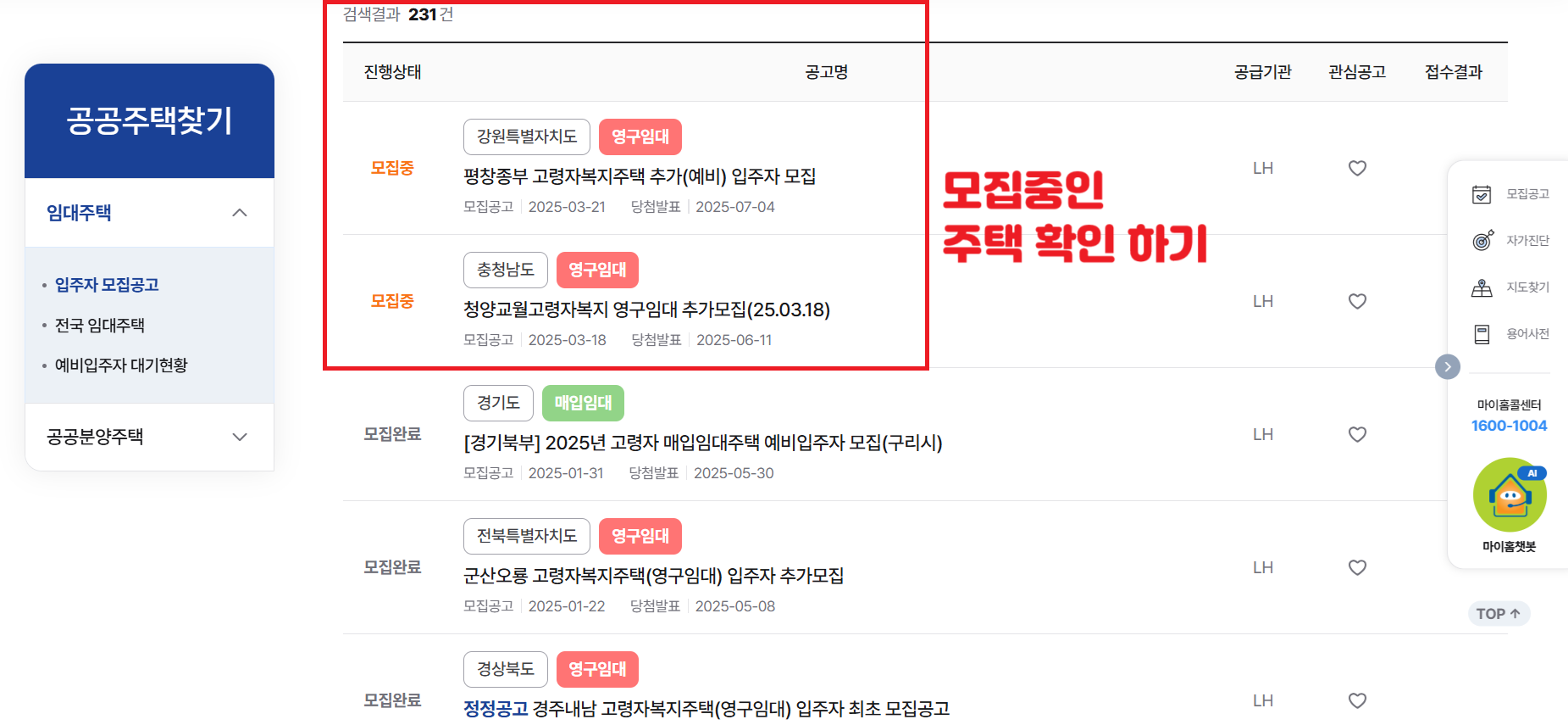 - 검색조건 공고명에 '고령자' 입력한 후, 현재 모집하고 있는 복지주택 공고 확인